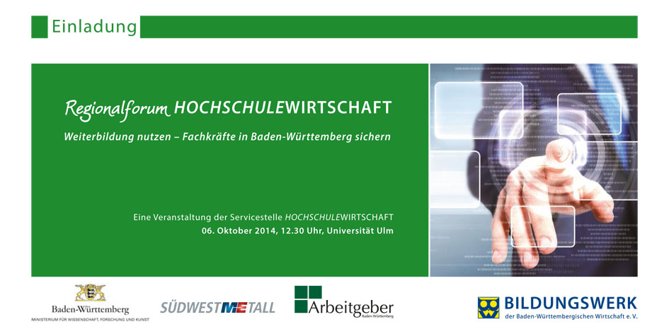 „Weiterbildung nutzen – Fachkräfte in Baden-Württemberg sichern“ lautet das Motto des nächsten Regionalforums HOCHSCHULE WIRTSCHAFT, das am 6. Oktober um 12:30 Uhr an der Universität Ulm (Forschungsgebäude N27) stattfinden wird. Im Mittelpunkt steht dabei die Zusammenarbeit zwischen Wirtschaft und Wissenschaft bei der akademischen Weiterbildung. Veranstalter sind die Servicestelle HOCHSCHULE WIRTSCHAFT, das Wissenschaftsministerium und SÜDWESTMETALL.