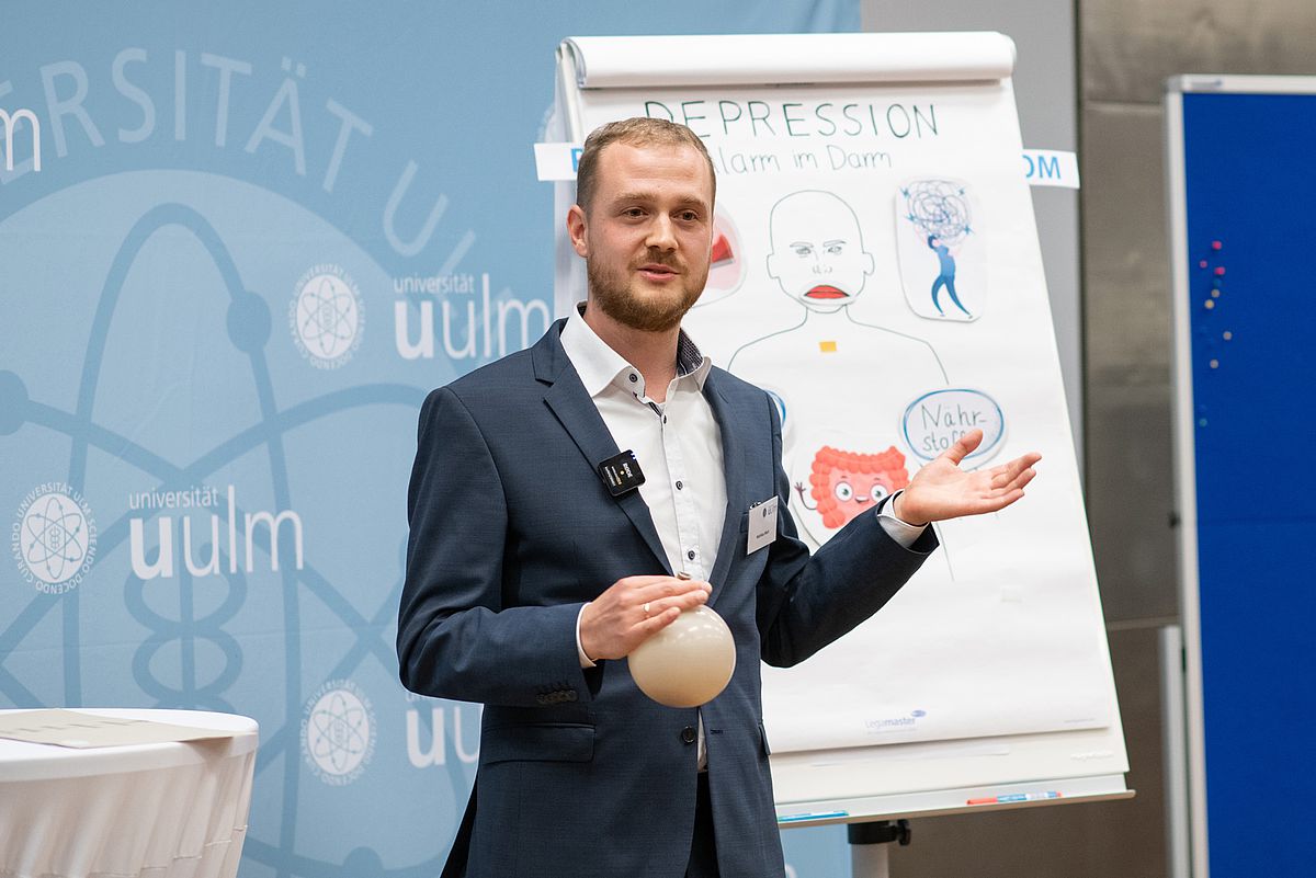 Gewonnen hat den Pitch-Wettbewerb schließlich Dr. Michael Barthelmäs, Postdoc in der Abteilung Sozialpsychologie am Institut für Psychologie und Pädagogik. Der Sozialpsychologe, der zugleich approbierter Psychotherapeut ist, forscht zu menschlichen Emotionen, insbesondere dem emotionalen Weinen. Mit dem Preisgeld in Höhe von 50 000 Euro möchte er eine Pilotstudie realisieren, die Laborbefunde auf den Prüfstand stellt und auf Alltagsuntersuchungen gründet. Den zweiten Platz und damit 30 000 Euro erhielt Dr. Matthias Mack. Der Biochemiker forscht am Institut für Psychologie und Pädagogik in der Abteilung für Klinische und Biologische Psychologie zur Frage, wie Darm und Depressionen zusammenhängen. Er möchte mit dem Preisgeld untersuchen, welchen Einfluss Stress und depressive Erkrankungen auf die Zusammensetzung des Darmmikrobioms haben und wie sich damit die Nährstoffversorgung im Organismus verändert.