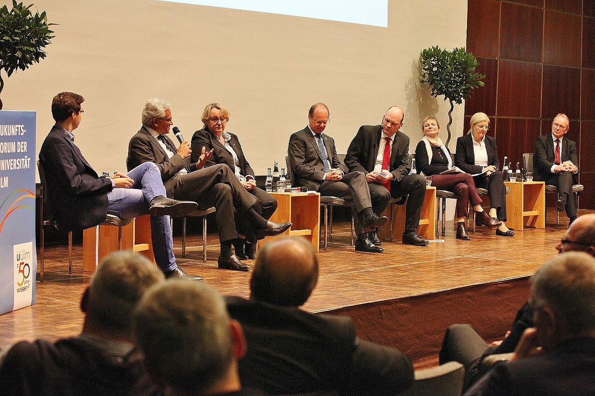 Seit ihrer Gründung im Jahr 1967 hat sich die Universität Ulm von einer medizinisch-naturwissenschaftlichen Hochschule zur internationalen Forschungsuniversität entwickelt. Erfolge der vergangenen 50 Jahre wurden im laufenden Jubiläumsjahr ausgiebig gewürdigt. Doch wie geht es mit der jüngsten Landesuniversität weiter? Wo steht die Uni Ulm in zehn oder gar in 50 Jahren? Dieses Gedankenexperiment wagten Mitte Oktober hochkarätige Vertreterinnen und Vertreter aus Forschung, Politik und Wirtschaft beim gemeinsamen Zukunftsforum der Ulmer Universitätsgesellschaft (UUG) und der Universität Ulm im Kornhaus.