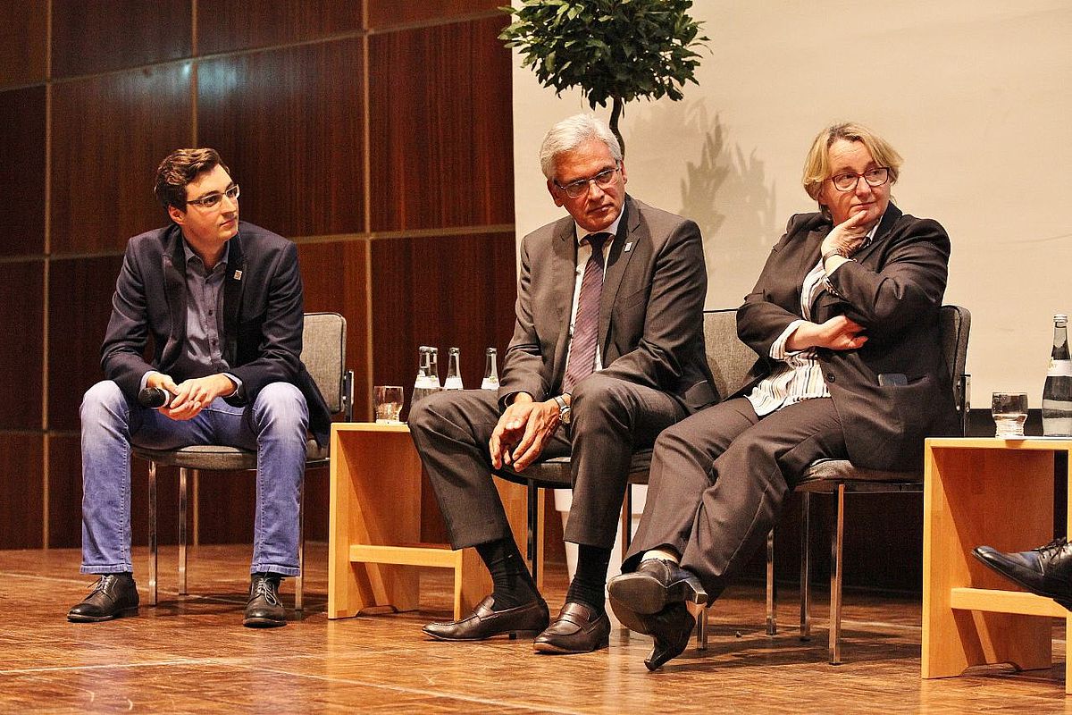 Im zweiten Teil der Veranstaltung, in dem es konkret um die Universität Ulm ging, war natürlich besonders die Meinung von Oberbürgermeister Gunter Czisch gefragt. Die Uni Ulm sei klein aber fein, und er sei stolz auf die geleistete Spitzenforschung. Der OB betonte insbesondere den engen Austausch mit den Wirtschaftsunternehmen in der Wissenschaftsstadt. Doch Czisch sieht durchaus Spielräume für weitere Verbesserungen: "Die Universität und die Stadt sind noch immer zu sehr getrennt. Wir brauchen in Zukunft mehr Schnittschnellen hin zur Stadtgesellschaft und Kraftzentren, wo sich Bürger- und Wissenschaft begegnen", regte das Stadtoberhaupt an. In Zukunft werde man auf dem Eselsberg leben, arbeiten und lernen, er denke dabei aber auch an kreative Begegnungsräume überall in der Stadt und ist dabei ganz nah an der Vision von Student Dlugosch, der die Uni gerne zum Experimentierkasten und Versuchslabor machen würde. Dort könnten Menschen im persönlichen Austausch voneinander lernen. Und dass die heutige Studierendengeneration noch immer politisch interessiert und engagiert ist, demonstrierten Studenten und Studentinnen gerade bei der Diskussion, in der sie Ministerin Bauer zur Rolle der Verfassten Studierendenschaft im geänderten Landeshochschulgesetz befragten.