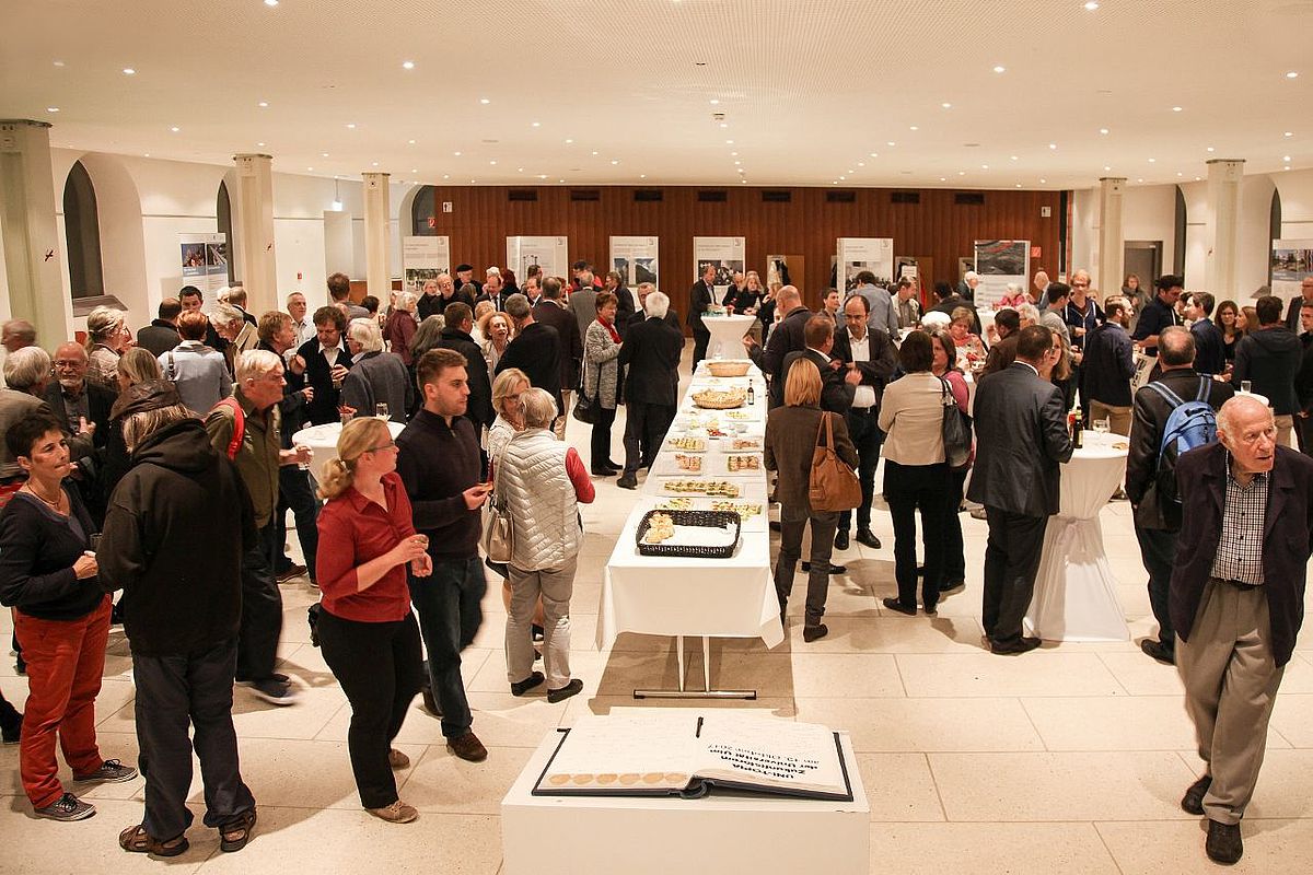 Entlassen zum Empfang wurden die Veranstaltungsgäste schließlich mit den ganz konkreten Visionen der Podiumsteilnehmer. "Was sehen Sie, wenn Sie an die Uni Ulm in fünfzig Jahren denken?", fragte Moderator Dr. Jan-Martin Wiarda, der mit seiner gewitzten Art und freundlichen Beharrlichkeit zum Gelingen des Zukunftsforums beitrug. Uni-Präsident Weber sah sich dabei mit einem emissionsfreien autonom steuernden Fahrzeug vom Bahnhof zum Campus auf dem Eselsberg fahren, der mit mehr als fünfzig Prozent an ausländischen Studierenden noch viel internationaler geworden ist. "In der Mensa wird es Essstäbchen geben, weil viele der Studierenden aus China kommen", glaubt die Berliner Professorin Sabine Kunst. OB Gunter Czisch und der Zeissianer Dr. Ulrich Simon waren sich einig, dass sich die Uni als exzellenter Forschungsstandort international behaupten werde. Ältere und jüngere Menschen würden dort gemeinsam lebenslang Lernen. Professorin Martina Brockmeier machte ihre Vision am Ulmer Münster fest und sagte, auch die Uni werde einmal weltweit Spitze sein. Und der jahrhundertelange Bau des weltweit höchsten Kirchturms habe ja gezeigt, dass man dabei auch mal eine Pause machen könne.