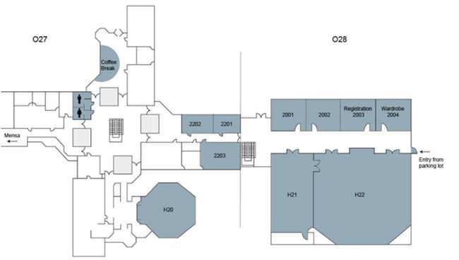 The university is situated in between the clinical center and further research structures. The plan of site is given below. EMISA'09 will be held in the O27 structure (the building is marked with an orange cross and is located on the right hand side in the plan. Below the plan of the Ulm University is also available as pdf for print.