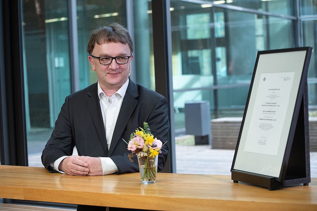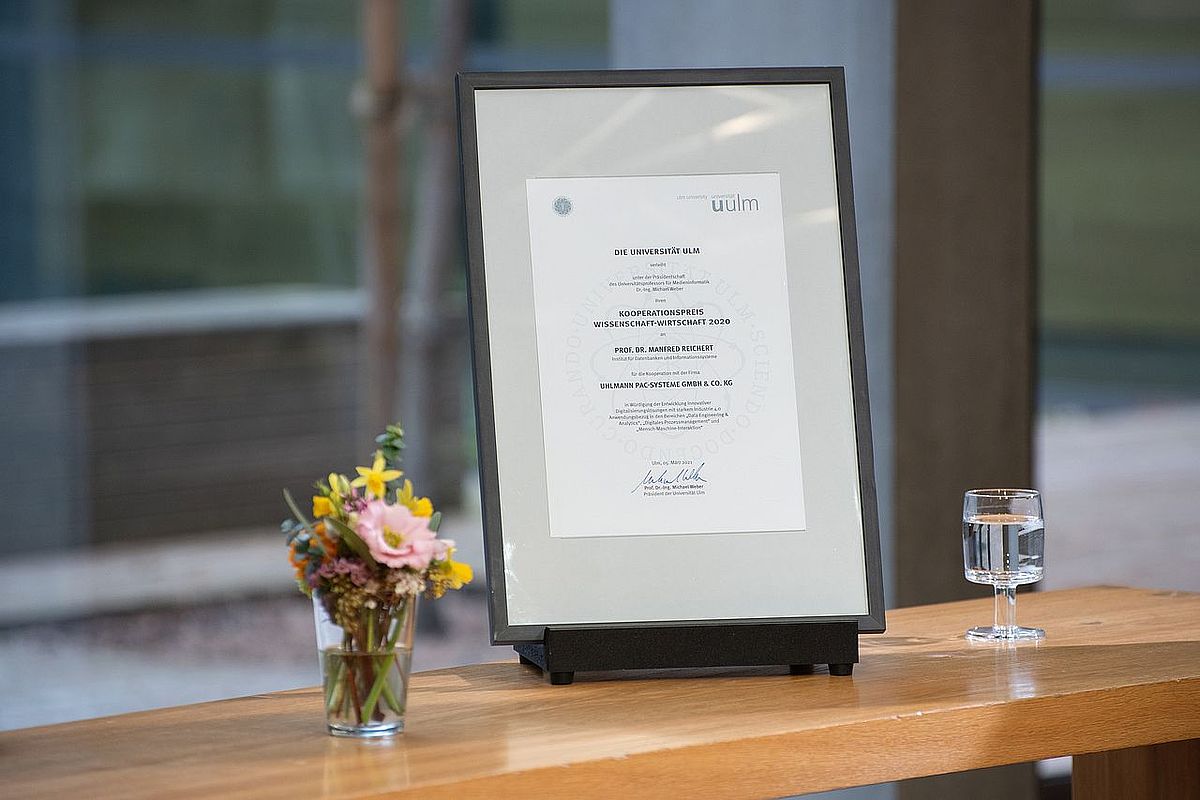 Professor Manfred Reichert, Leiter des Instituts für Datenbanken und Informationssysteme (DBIS), erhielt für seine langjährige Zusammenarbeit mit der Firma Uhlmann Pac-Systeme GmbH & Co. KG einen der beiden mit jeweils 4000 Euro dotierten Kooperationspreise Wirtschaft-Wissenschaft 2020 der Universität Ulm. Übergeben wurde der Preis von Uni-Präsident Michael Weber anlässlich des ersten digitalen Dies academicus.