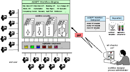 Scalability and Distributed Workflow Control: In large-scale, enterprise-wide application scenarios performance is a critical issue. Due to the high amount of communication between server(s) and clients the communication network may become a bottleneck, especially if a large amount of "long-distance" communication occurs. To avoid bottlenecks, ADEPT allows to reduce the network load by partitioning WF graphs and by migrating the control of WF instances from one server to another during run-time; i.e., a WF instance may no longer be controlled by only one WF server. When performing such a migration, a description of the instance state is transmitted to the target server. This includes information about activity states as well as WF relevant data. To avoid unnecessary communication between servers, ADEPT allows to control parallel branches of a WF instance independently from each other (at least as no synchronization due to other reasons, e.g. a dynamic WF change, becomes necessary). For further details see the ADEPTdistribution homepage.