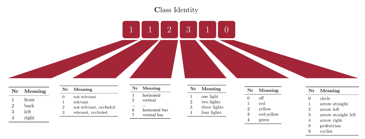 Diese Attribute werden durch eine sechsstellige Klassenidentitätsnummer zusammengefasst (Anmerkung 04/21: nur DTLD v1.0!). Ab 04/21, DTLD v2.0, wird die Klassenidentitätsnummer durch ein Attribut-Dictionary ersetzt. Zusätzlich zu den bislang annotierten Attributen wird Reflektion beigefügt. Dies gibt an, ob das Lichtsignal lediglich eine Reflektion, z. B. in Schaufenstern, ist Darüber hinaus besitzt jedes Label eine Trackidentitätsnummer (nützlich für die Auswertung von Trackingverfahren). Für jedes Bild exisiert ein Zeitstempel und einige Fahrzeugdaten (GPS Position, Geschwindigkeit, Gierrate).