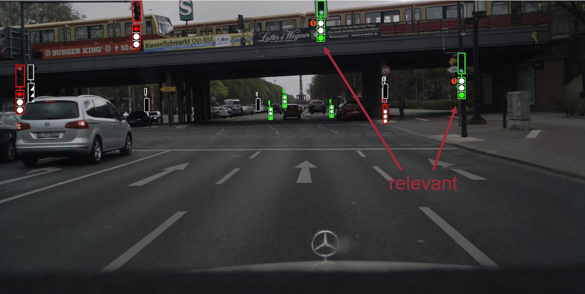 - Relevant: Eine Lichtsignalanlage ist relevant wenn es für die geplante Route des Ego-Fahrzeugs gültig ist.