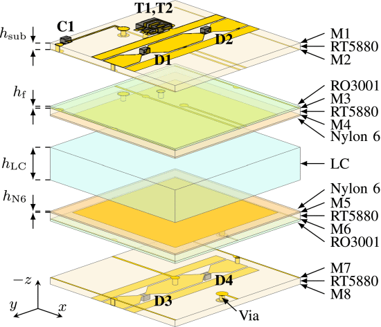 In dieser Arbeit verfolgen die Autoren die Idee, einen verlustarmen Phasenschieber zu schaffen, indem sie p-i-n-Dioden zur Abstimmung der elektrischen Antwort und Flüssigkristalle zur Abstimmung der magnetischen Antwort einer gestapelten Multimaterial-Einheitszelle verwenden. Sie demonstrieren das Konzept bei 10 GHz mit einem einzelnen Element, das in ein Hohlleitergehäuse integriert ist, um die Phasenabstimmung direkt zu charakterisieren. In der bestehenden Konfiguration ist die Reaktionszeit extrem langsam, aber es wird erwartet, dass sich dies bei höheren Frequenzen verbessert.