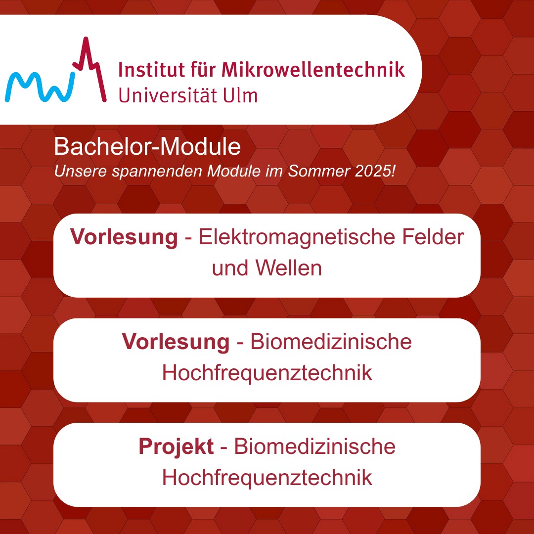 Nächste Woche beginnt die Vorlesungszeit des Sommersemesters 2025. Eine kurze Übersicht zu den vom MWT angebotenen Bachelor- und Master-Modulen findet ihr unter www.uni-ulm.de/in/mwt/lehre. Dabei wird vom MWT erstmals die Vorlesung "Biomedizinische Hochfrequenztechnik" mit einem Projektteil angeboten.