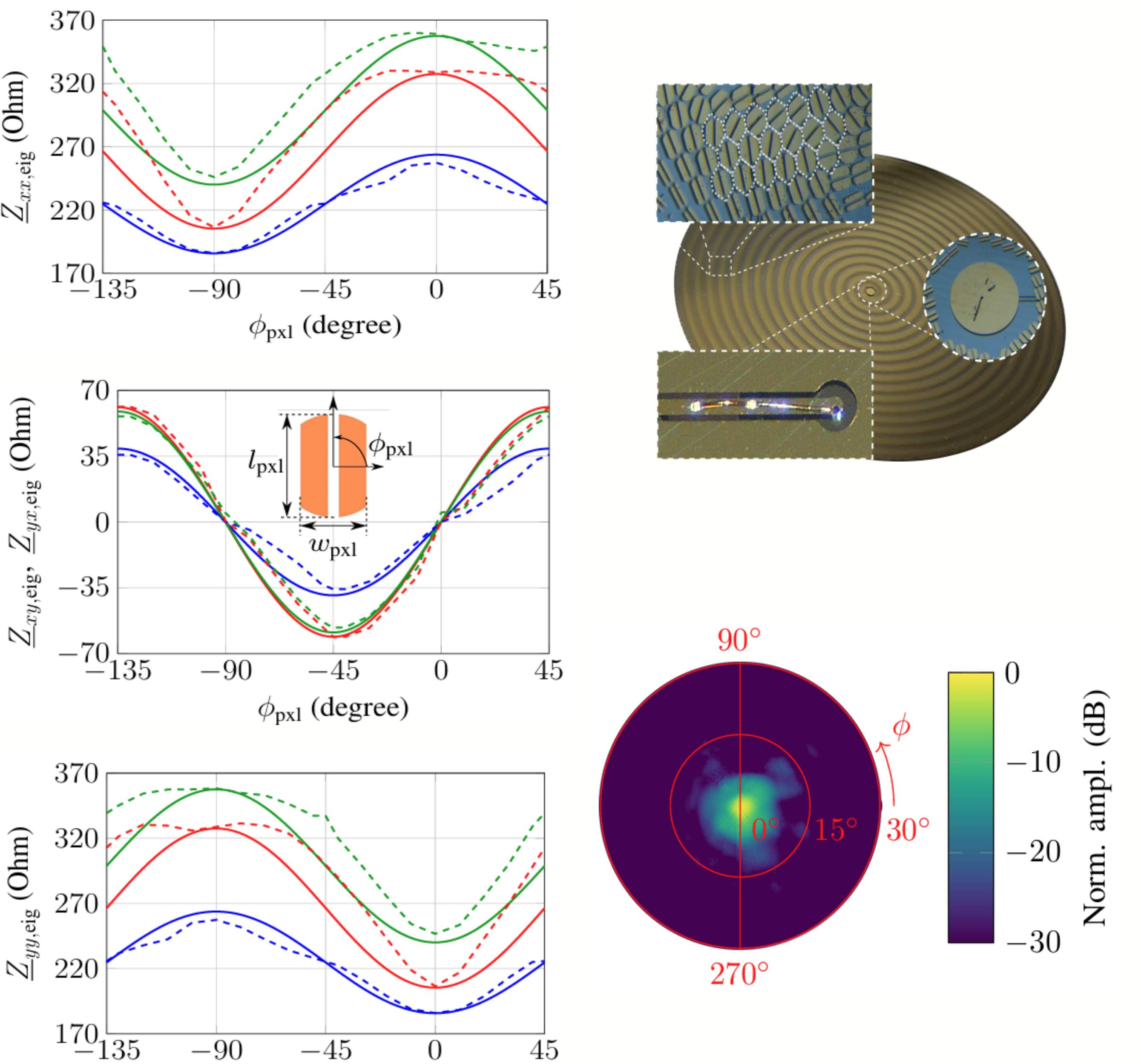 In unserer neusten Arbeit stellen wir eine neuartige Methode zur effizienten und präzisen Extraktion anisotroper Impedanztensoren für beliebig geformte Einheitszellen und Pixelgeometrien vor. Die Eigenvektoren des rein isotropen Tensors werden mithilfe der Rotationsmatrix modifiziert, um den anisotropen Impedanztensor zu erhalten. Dieser Ansatz ermöglicht eine hocheffiziente Charakterisierung von Metaoberflächen und folglich die Realisierung hochperformanter holographischer Antennen.