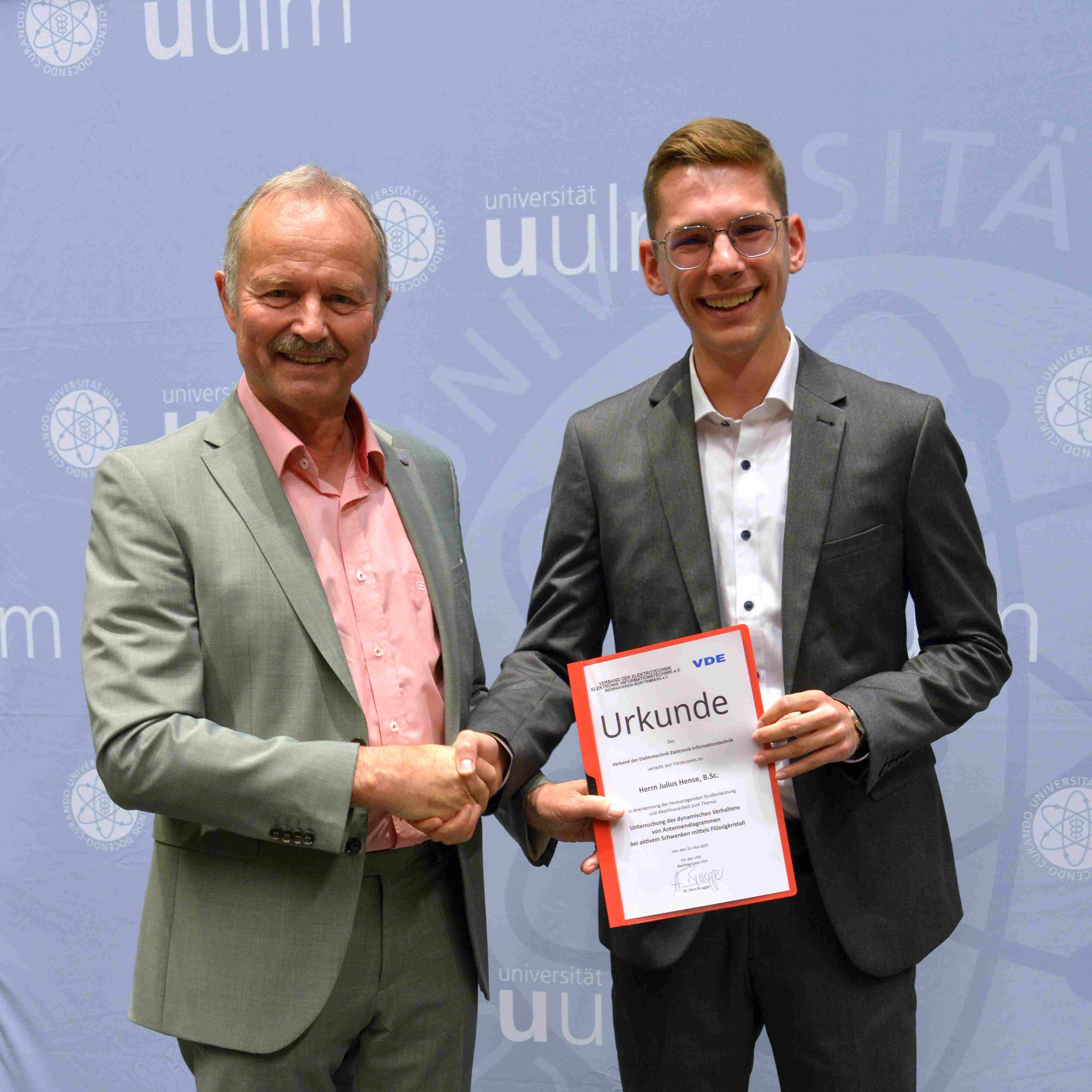 Wir gratulieren Julius Hense zum VDE Preis, den er für seine Bachelorarbeit mit dem Titel "Untersuchung des dynamischen Verhaltens von Antennendiagrammen bei aktivem Schwenken mittels Flüssigkristalls" erhalten hat.