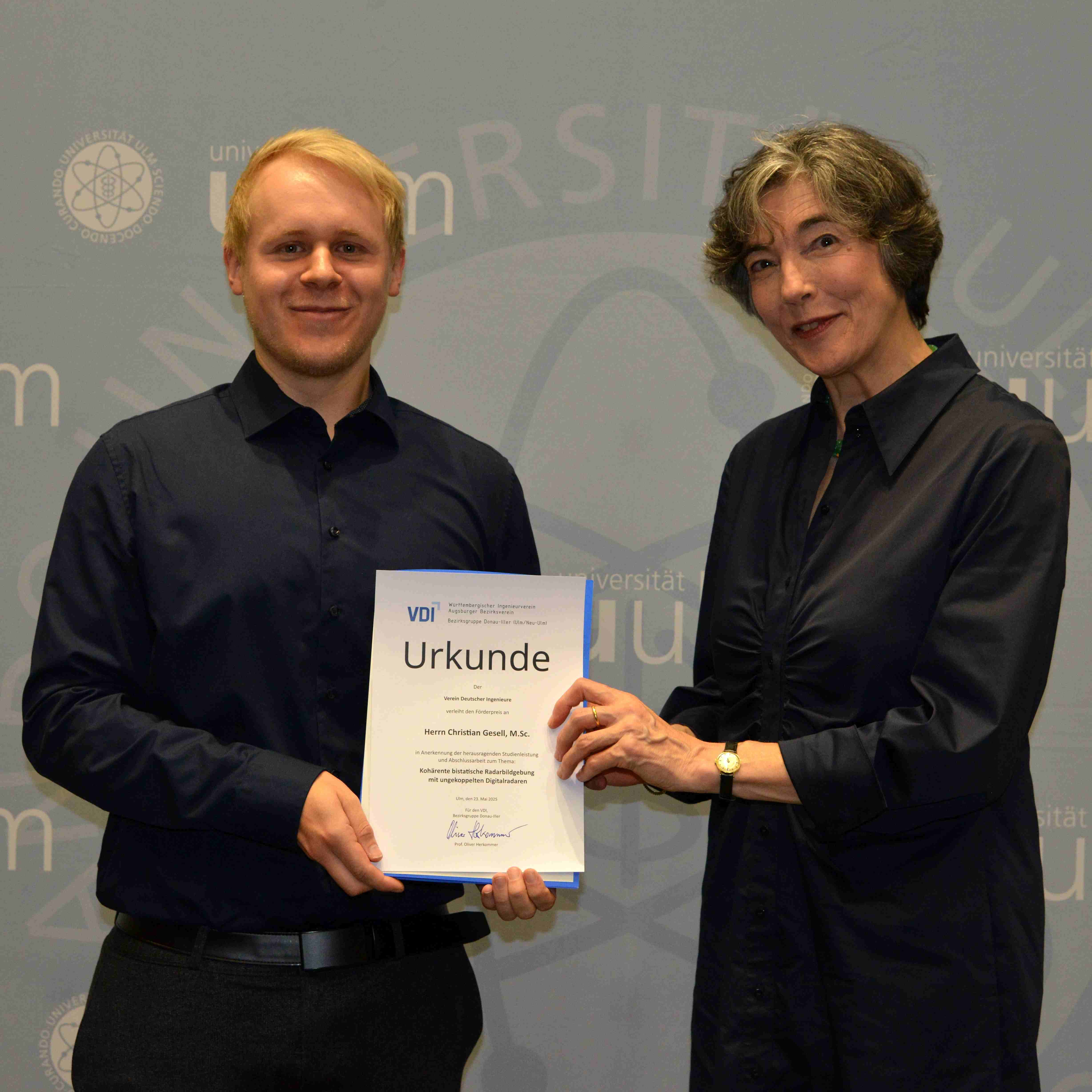 Christian Gesell hat für seine Masterarbeit mit dem Titel „Kohärente bistatische Radarbildgebung mit ungekoppelten Digitalradaren“ den VDI Preis erhalten. Herzlichen Glückwunsch!