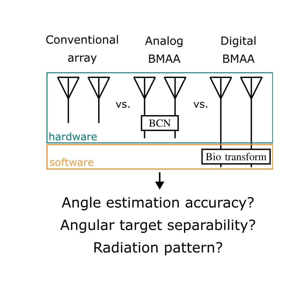 Biomimetische Antennenarrays (BMAAs) können durch die gezielte Verkopplung der Antennensignale die Phasensensitivität erhöhen. In folgender Arbeit wird erstmals aufgeschlüsselt wie sich diese biomimetische Verkopplung auf die Winkelschätzgenauigkeit, die Trennfähigkeit von Zielen und das Strahlungsdiagramm auswirkt. Hierbei zeigen analoge BMAAs vor allem Vorteilen gegenüber konventionellen Antennensystemen bezüglich der Trennfähigkeit von Zielen und der Vermeidung von Mehrdeutigkeiten der Winkelschätzung. Die leicht anwendbare digitale Emulation der biomimetischen Verkopplung im Post-Processing erlaubt je nach Arrayaufbau eine Verbesserung der Winkelschätzgenauigkeit ohne großen Anwendungsaufwand oder den Verlust von Reichweite des Radarsystems. Publiziert im IEEE Transactions on Antennas and Propagation.