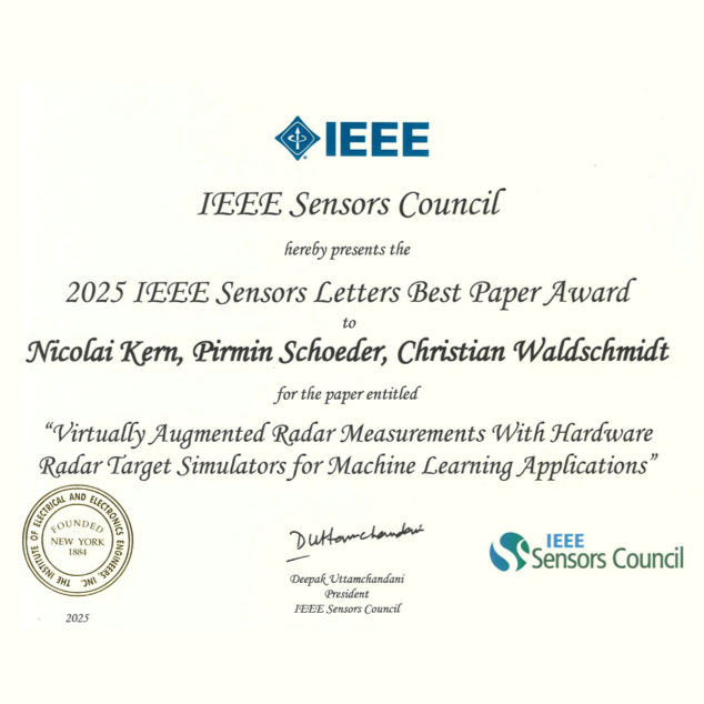 Herzlichen Glückwunsch an Nicolai Kern zum IEEE Sensors Letters Best Paper Award in 2025 für sein Paper "Virtually Augmented Radar Measurements With Hardware Radar Target Simulators for Machine Learning Applications".