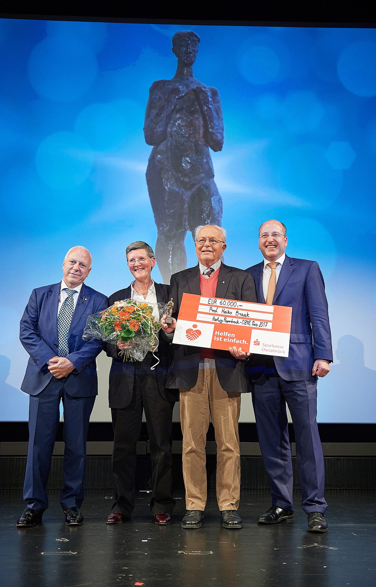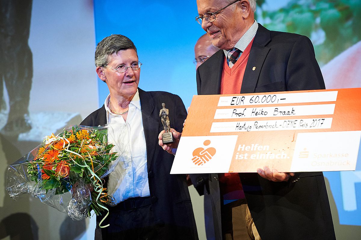 Der Ulmer Hirnforscher Heiko Braak hat den mit 60.000 Euro dotierten „Hartwig Piepenbrock-DZNE Preis“ erhalten. Das Unternehmen Piepenbrock und das DZNE würdigen damit Braaks bahnbrechende Forschung über die Alzheimer- und die Parkinson-Krankheit. Seine Erkenntnisse haben die Vorstellung davon, wie sich diese Erkrankungen im Gehirn verbreiten, maßgeblich beeinflusst und Entwicklungen in der Diagnostik und in der Therapieforschung angestoßen. Die Auszeichnung wurde im Beisein von NRW-Wissenschaftsstaatssekretärin Annette Storsberg verliehen. Die Preisübergabe war Teil einer Abendveranstaltung rund um Hirnforschung, Musik und Humor. Durch das Programm führte der Medizin-Kabarettist Eckart von Hirschhausen.