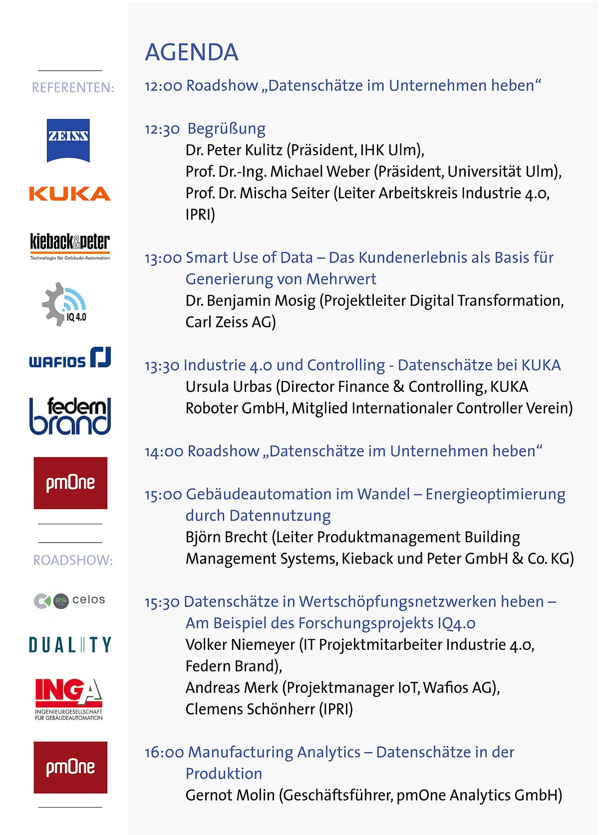 "Im Mittelpunkt der Veranstaltung stehen dabei Fragen aus dem Bereich Business Analytics. Wie können diese Datenschätze für die Optimierung von unternehmerischen Entscheidungen genutzt werden, insbesondere was die Planung, Steuerung und Kontrolle in Managementprozessen angeht?", so Professor Mischa Seiter. Der Professor für Wertschöpfungs- und Netzwerkmanagement an der Universität Ulm leitet das IPRI und den AK 4.0. Bei der Veranstaltung berichten hochkarätige Referenten aus der Wirtschaft über ihre Erfahrungen aus der Unternehmenspraxis. Aber auch wissenschaftliche Ansätze zum Thema werden vorgestellt. Bei einer "Roadshow" präsentieren sich außerdem Firmen, die speziell zugeschnittene Lösungen für die datenbasierte Prozessoptimierung im Unternehmen anbieten. Zu den Referenten aus der Wirtschaft gehören Unternehmensvertreter der Carl Zeiss AG, der KUKA Roboter GmbH, der WAFIOS AG, der Brand KG, der Kieback&Peter GmbH & Co. KG sowie der pmOne Analytics GmbH. Die Themen reichen dabei von der Gebäudeautomation, der Kundenpflege und Energieoptimierung bis hin zur Reorganisation industrieller Produktionsprozesse.