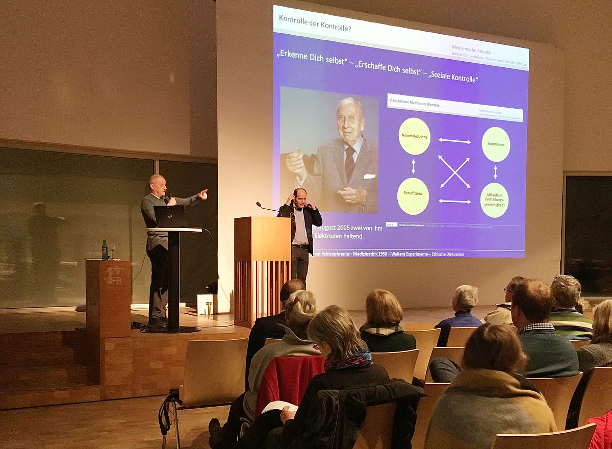 Nach einem historischen Abriss zur Entwicklung dieser neurologischen Behandlungsmethode, die seit spätestens den 50er Jahren als in Teilen reversibler chirurgischer Eingriff durchgeführt und therapeutisch genutzt wird, zeigte Fangerau auf, wie seit den frühen 60er Jahren moralische und gesellschaftliche Aspekte dieser Therapie diskutiert wurden. "Bis in die 50er Jahre gab es zur Behandlung psychischer und psychiatrischer Erkrankungen so gut wie keine wirkungsvollen Medikamente. Dies erklärt, dass die THS in den Anfangsjahren bei einer ganzen Reihe von `Nervenkrankheiten´, aber auch von `Verhaltensstörungen´, eingesetzt wurde", erklärte der Medizinethiker, der von 2008 bis 2014 an der Universität Ulm geforscht und gelehrt hat, und dort als Gründungsdirektor das Institut für Geschichte, Theorie und Ethik der Medizin aufgebaut hat. Frühe Behandlungsversuche gab es nicht nur bei Schizophrenie und Depression, sondern auch bei Homosexualität und unerwünschtem Sozialverhalten.
