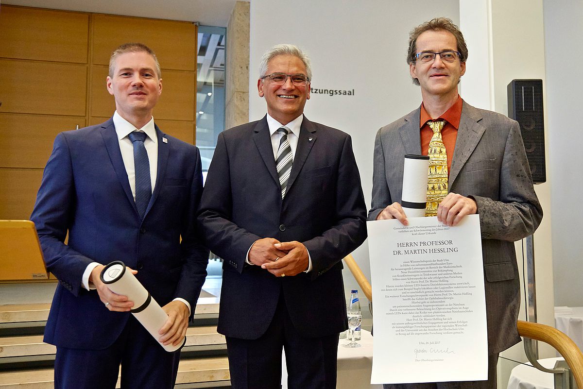 Der Wissenschaftspreis der Stadt Ulm für hervorragende wissenschaftliche Leistungen wird an herausragende Personen, Forschungs- oder Arbeitsgruppen der Universität und der Hochschule Ulm vergeben. Aufgrund des 50. Jubiläums der Universität war die Preisverleihung, die sonst alle zwei Jahre stattfindet, von 2016 auf 2017 verschoben worden. Den Wissenschaftspreis für die Hochschule Ulm nahm in diesem Jahr Professor Martin Heßling entgegen, für seine herausregenden Leistungen im Bereich Medizintechnik. Der Wissenschaftler von der Fakultät für Mechatronik und Medizintechnik wurde ausgezeichnet für seine angewandte Forschung zum Einsatz von LEDs bei der Desinfektion von Trinkwasser sowie zur Durchführung patientenschonender Augenoperationen.