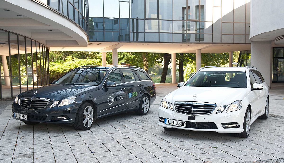 Zwei hochautomatisierte Fahrzeuge der Ulmer Forscher (Foto: Elvira Eberhardt / Uni Ulm)