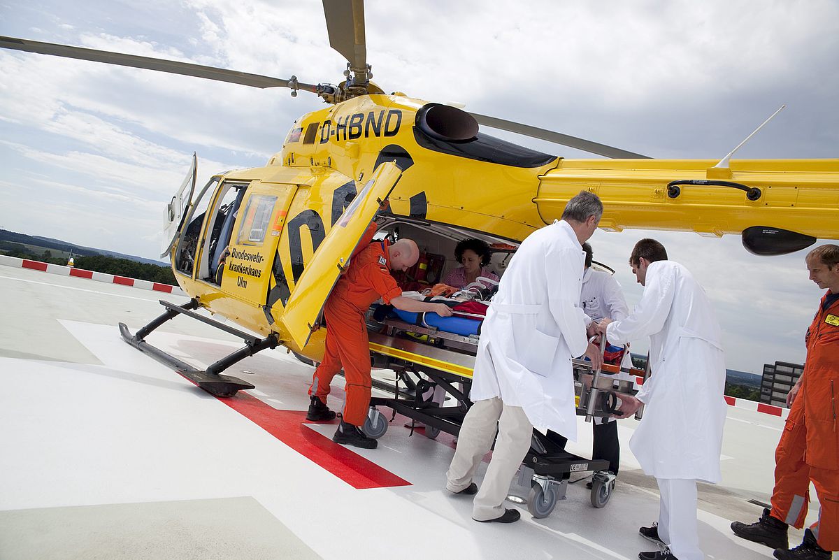 Notfallmediziner des Universitätsklinikums mit einem Rettungshubschrauber des ADAC (Foto: Heiko Grandel / Uniklinikum Ulm)
