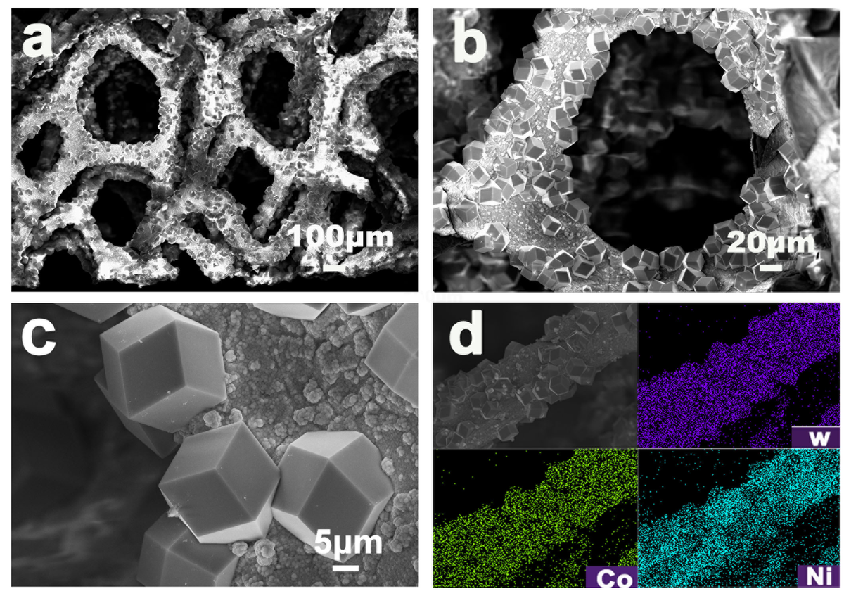 Als Material für die Elektroden verwendeten die Wissenschaftler einen Metall-Schaum aus Nickel, der sich aufgrund seiner hohen Leitfähigkeit und besonderen Oberflächenstruktur bei der Elektrolyse bewährt hat. "Doch wie bringt man das katalytisch aktive POM-Material dazu, mit der Nickel-Schaum-Elektrode eine stabile Verbindung einzugehen?", umschreibt der Ulmer Doktorand Benjamin Schwarz die materialchemische Ausgangsfrage. Dem deutsch-chinesischen Forscherteam ist es gelungen, über ein einfaches hydrothermales Verfahren die ursprünglich gelösten Polyoxometallate als Mikrokristalle auf der Elektrodenoberfläche abzuscheiden. Die Elektroden werden dafür bei 180 Grad Celsius acht Stunden lang in eine POM-Lösung getaucht. "Unter dem Rasterelektronenmikroskop kann man die POM-Kristalle deutlich erkennen. Diese zeigen wunderbare kristalline Formen und sind fest mit der Elektrodenoberfläche verbunden", beschreibt Professor Yu-Fei Song. Song leitet an der Bejing University of Chemical Technology das State Key Laboratory of Chemical Resource Engineering und hat mit seinen Doktoranden Wenijing Luo und Jun Hu die hochaufwändigen chemisch-physikalischen Oberflächenanalysen durchgeführt.