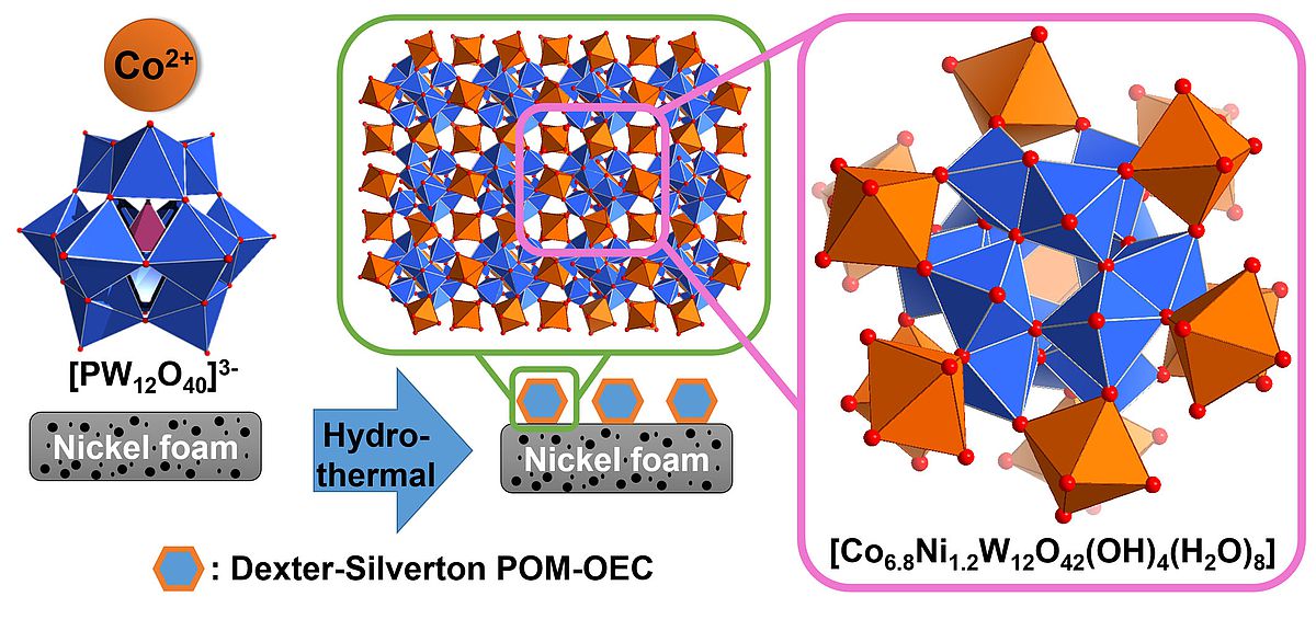 Zum Einsatz kommen dabei bestimmte Polyoxometallate (POMs). Diese besonderen Metalloxide sind molekulare Cluster aus so genannten Übergangsmetallen, die über Sauerstoffatome miteinander verbrückt sind und dabei dreidimensionale Netzwerke ausbilden. Aufgrund ihrer hohen Redoxaktivität und ihrer herausragenden Stabilität unter oxidierenden Bedingungen eignen sie sich bestens als Katalysatoren für die Sauerstoffentwicklung. In den reaktiven Zentren dieser Metalloxid-Cluster sind die chemischen Elemente Nickel und Kobalt verbaut. Diese beiden Übergangsmetalle erfüllen in idealer Weise die Voraussetzungen für die Oxidation von Wasser. Das zugesetzte Wolfram, das ebenfalls zur Reihe der Übergangsmetalle gehört, dient als strukturstabilisierendes Element. "Diese sogenannten Dexter-Silverton-Polyoxometallate sind als katalytisch aktive Materialien weitaus kostengünstiger als die ansonsten gebräuchlichen Edelmetalle wie Platin", sagt Streb. Für den kommerziellen Einsatz sei dies deutlich von Vorteil.