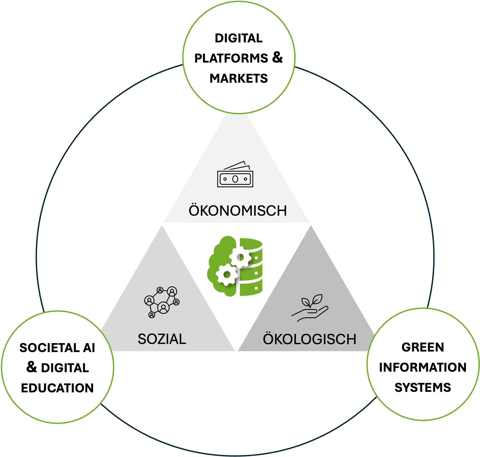 Unsere Forschung gliedert sich in die Forschungsschwerpunkte Digital Platforms & Markets, Societal AI & Digital Education, und Green Information Systems.