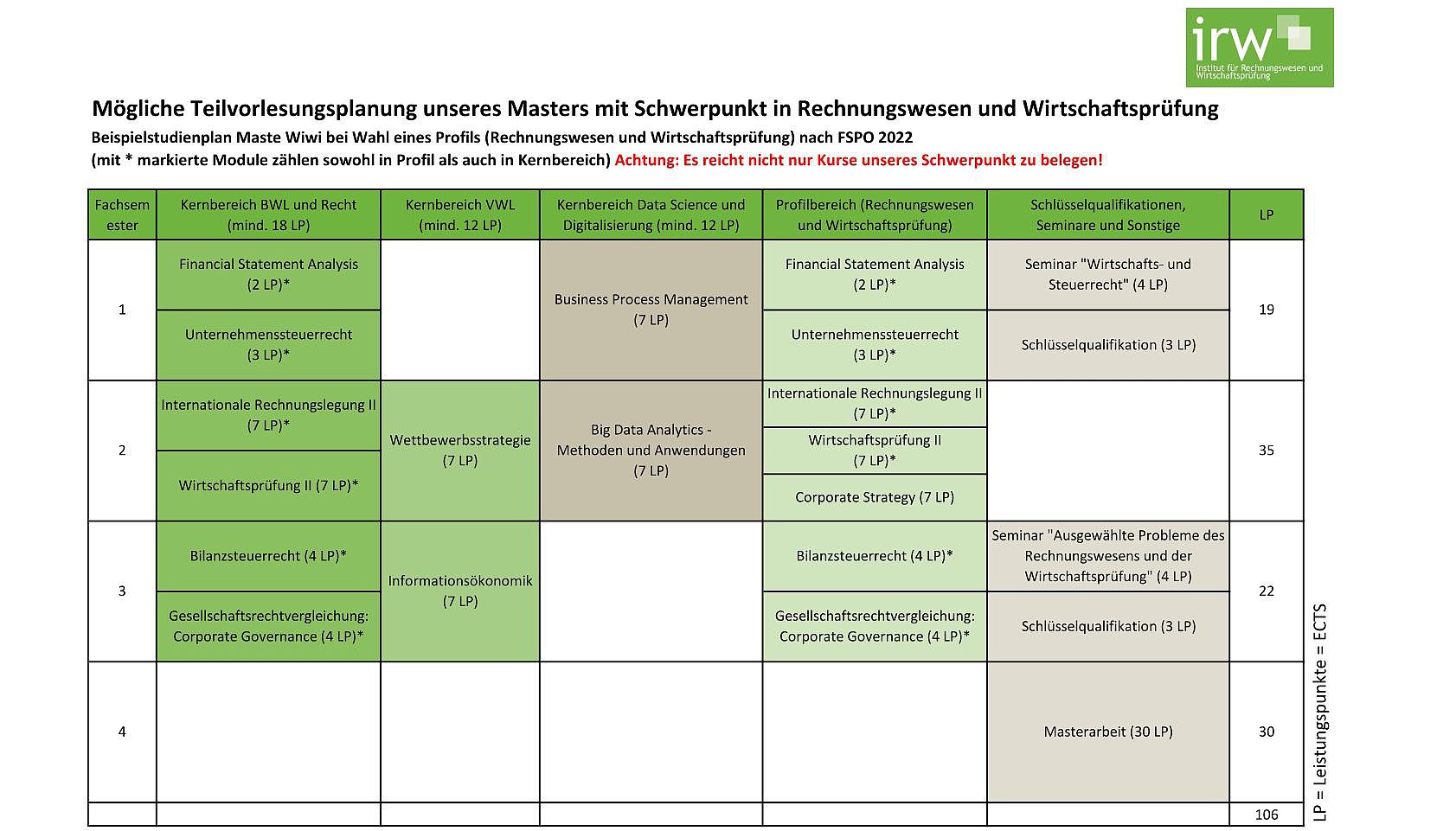 Für Masterstudierende des Schwerpunktfaches „Rechnungswesen und Wirtschaftsprüfung“ stellen die aufeinander abgestimmten Lehrveranstaltungen ein in sich stimmiges und umfassendes Ausbildungskonzept dar.