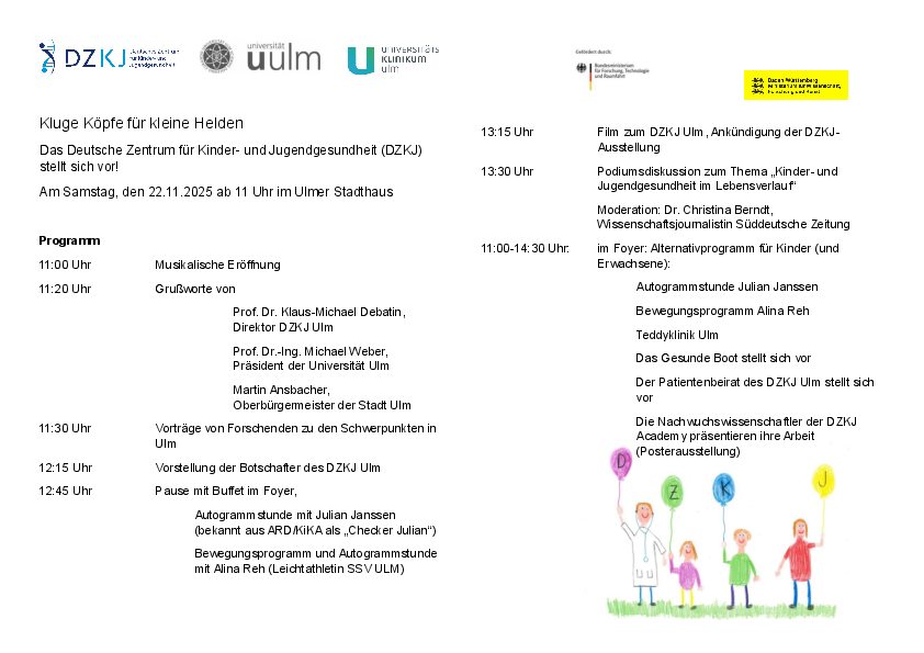 Am Samstag, den 22. November, präsentiert sich das Deutsche Zentrum für Kinder- und Jugendgesundheit (DZKJ) mit einem Event im Ulmer Stadthaus der Öffentlichkeit (Beginn: 11 Uhr). Die Veranstaltung richtet sich an Groß und Klein und ist kostenlos. Das Programm bietet Vorträge, eine Podiumsdiskussion sowie Angebote mit Sport und Spiel für Kinder im Foyer.