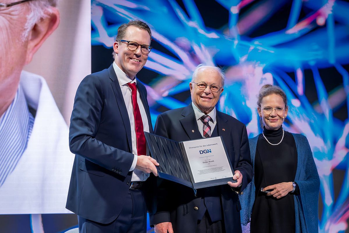 Der Ulmer Neurologie-Forscher Professor Heiko Braak hat den Ehrenpreis für sein Lebenswerk von der Deutschen Gesellschaft für Neurologie (DGN) erhalten. Beim Kongress in Berlin wurde der 86-jährige Ulmer vergangene Woche ausgezeichnet. Professor Braak hat unter anderem die nach ihm benannten Braak-Stadien definiert, nach denen sich der Krankheitsverlauf neurodegenerativer Erkrankungen anhand typischer Veränderungen im Gehirn einteilen lässt.