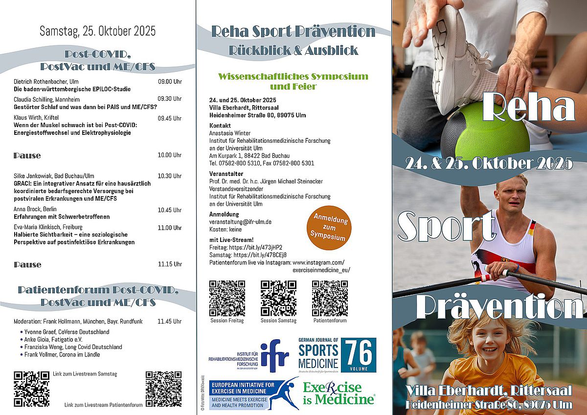 Die Tagung „Reha, Sport und Prävention“, die vom 24. bis zum 25. Oktober in der Ulmer Villa Eberhardt stattfindet, widmet sich im Schwerpunkt den Langzeitfolgen von Covid19. Vorgestellt und diskutiert werden interdisziplinäre Reha-Strategien und patientengerechte Versorgungsmodelle für Long-Covid-Betroffene. Außerdem geht es um viele andere Themen aus der klinischen, therapeutischen und präventiven Sportmedizin: etwa um Sport bei Hitze, Risiken bei der Rückkehr nach Verletzungspausen im Profifußfall oder Leistungsphysiologie im Hochleistungssport.