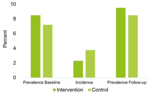 The number of children who were classified as abdominally obese increased from baseline to follow-up (7.8% to 9.2%, respectively). The odds of developing abdominal obesity in the intervention group were less than half as great as in the control group (Kobel et al., 2019a).