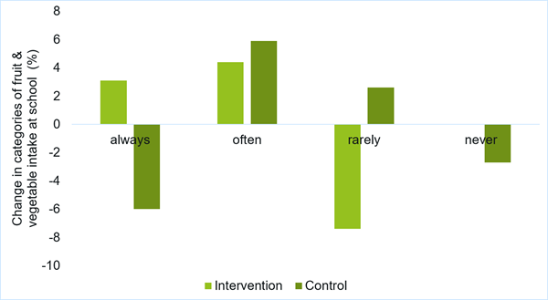Fruit and vegetable intake increased significantly for first graders (p = 0.050), children from families with high parental education levels (p = 0.023), and children with overweight fathers (p = 0.034). Significant group differences were found in the fruit and vegetable intake of children with migration backgrounds (p = 0.01) and those with parents who have a high school degree (p = 0.019) (Kobel et al., 2022a). When controlling for migration background, the proportion of children in the intervention group who never or rarely ate fruit and vegetables decreased significantly from baseline to follow-up (p = 0.010) (Kobel et al., 2017c).