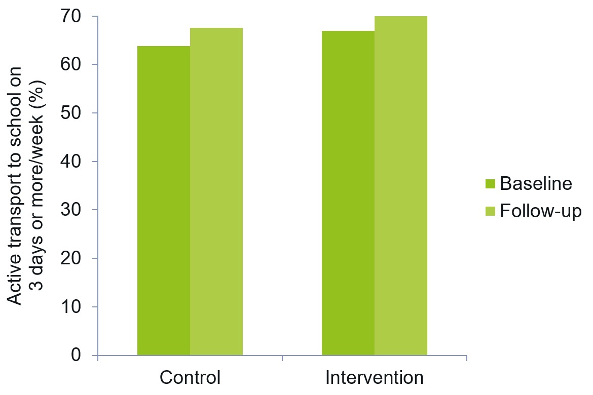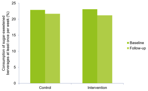 At baseline, 24.6% of boys and 22.6% of girls drank sugar-sweetened beverages at least once per week. A significant reduction of soft drink consumption was seen in both the intervention and control group, with trends in a greater reduction among the intervention group (Kobel et al., 2014).