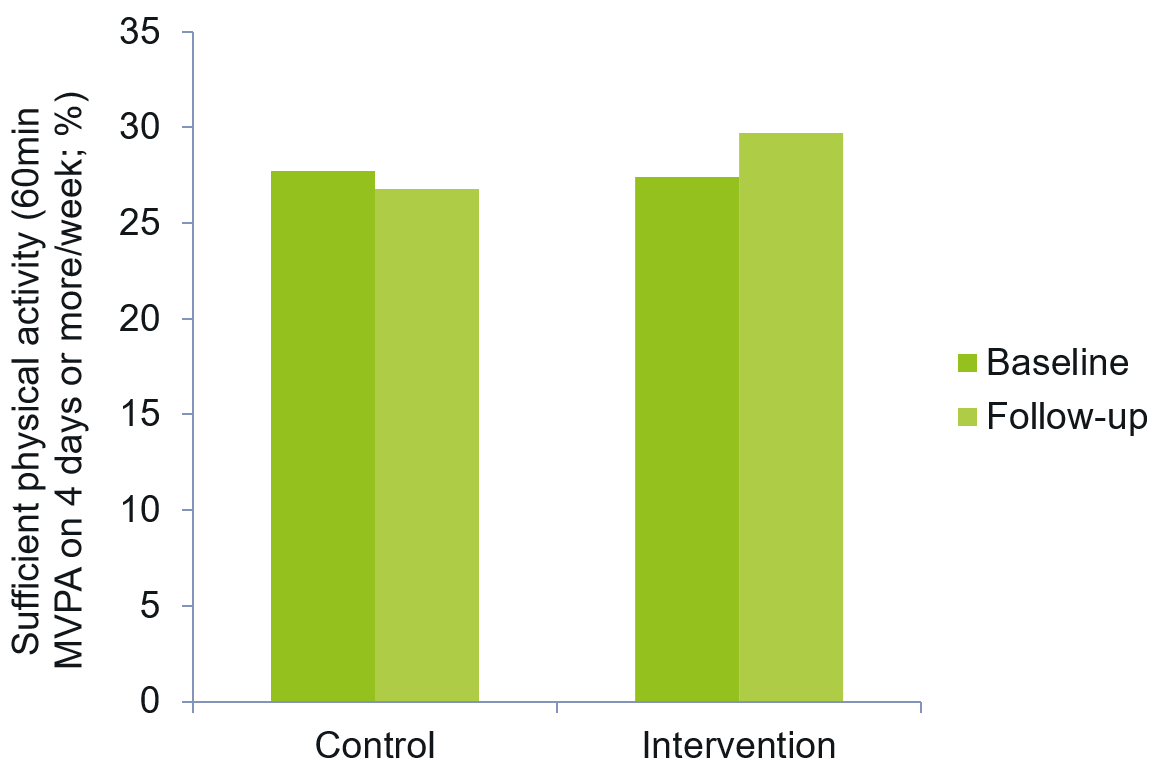 Assessed subjectively, at baseline, children engaged in 60 minutes of moderate-to-vigorous physical activity (MVPA) on 2.74 (± 1.66) days per week. 31.9% and 22.2% of boys and girls, respectively, spent at least four days per week being moderately to vigorously physically active for at least 60 minutes. At follow-up, boys spent marginally more time in MVPA and there was a tendency towards more physical activity in the intervention group and a slight, although not statistically significant, reduction of physical activity in the control group (Kobel et al., 2014).