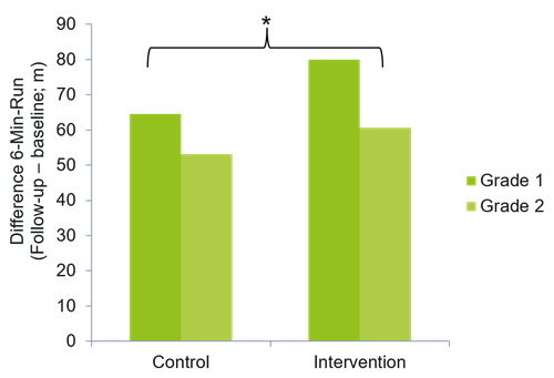 Children in the intervention group saw greater improvements in their endurance capability (measured with a 6-minutes-run) from baseline to follow-up, as children in the control group (70.51 ± 128.62 m; p = 0.046) (Kobel et al., 2019a).
