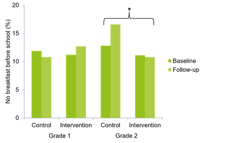 At baseline, 12.9% of children reported that they rarely eat breakfast before leaving for school. At follow-up, a tendency could be observed of children in the control group skipping breakfast more often, whereas the number of children who skipped breakfast in the intervention group remained the same. Considering children in grade one and grade two separately, this trend becomes significant among second graders: the second graders in the control group skipped breakfast significantly more often than those in the intervention group (OR = 0.52, p = 0.024, 95% CI [0.30;0.92]) (Kobel et al., 2014).