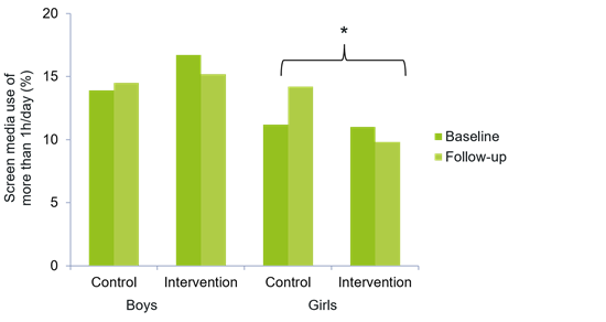 Baseline results of screen media use show that 15.4% and 11.2% of boys and girls, respectively, spent a minimum of one hour per day using screen media. At follow-up, there was a tendency towards less screen media use in the intervention group, whereas the opposite trend could be observed in the control group. Considering girls and boys separately, there is a significant difference between control and intervention groups with only girls in the intervention group using significantly less screen media per day than their counterparts in the control group (OR = 0.58, p = 0.04, 95% CI [0.35;0.96]).