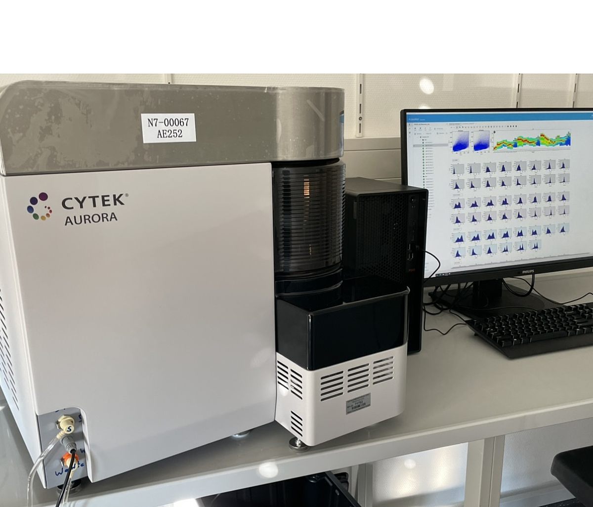 - 4 Laser (blau, rot, violett, UV) und 57 Detektionskanäle (54 Fluoreszenzkanäle, FSC, blue laser SSC, violet laser SSC) ermöglichen die Erfassung des kompletten Emissionsspektrums