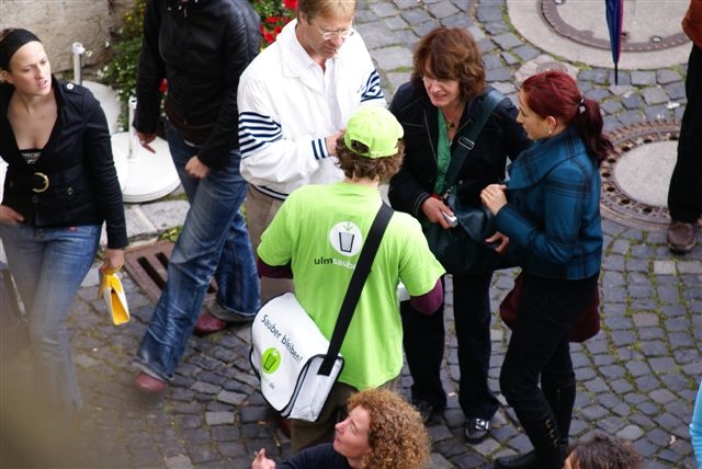 Das man seinen Abfall, seien es Zigarettenkippen, Kaugummis oder nur der kleine Papierabfall, nicht einfach in der Stadt wegwerfen sollte, gehört eigentlich zum guten Ton. Trotzdem sieht man diesen Unrat zu Hauf in den Straßen der Stadt Ulm. Zu diesem Zweck haben wir, in Zusammenarbeit mit den Entsorgungsbetrieben der Stadt Ulm (EBU) regelmäßig Promotionsaktionen durchgeführt, um die Menschen auf dieses Problem aufmerksam zu machen und Sie dazu anzuregen, ihren Müll nicht einfach fallen zu lassen.