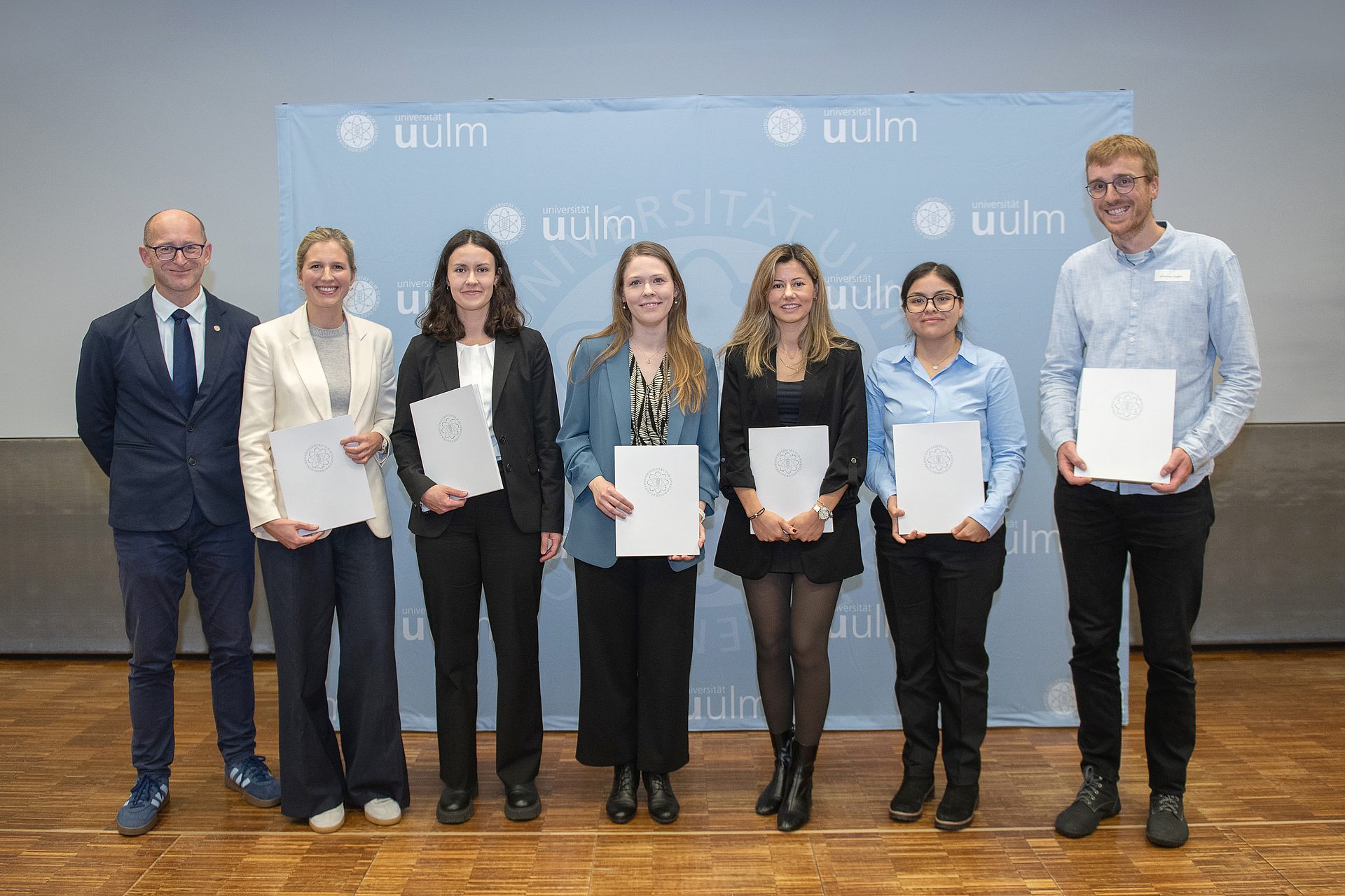 Universitätspräsident Prof. Michael Weber (rechts) mit v.l.: Dr. Andreas Obermeier, Ann-Kathrin Kissmann, Dr. Melissa Hitzler, Dr. Robin Lochbaum und Dr. Sarah Schröder