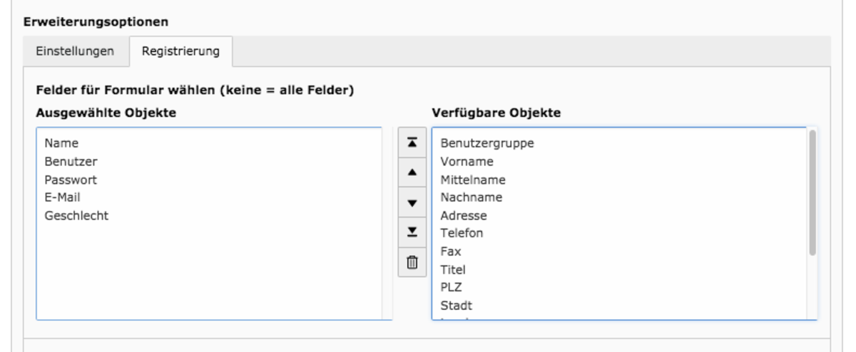 Im nächsten Schritt bestimmen Sie die Elemente die im Registrierungsformular abgefragt werden sollen. Diese finden Sie in der Registerkarte "Registrierung".