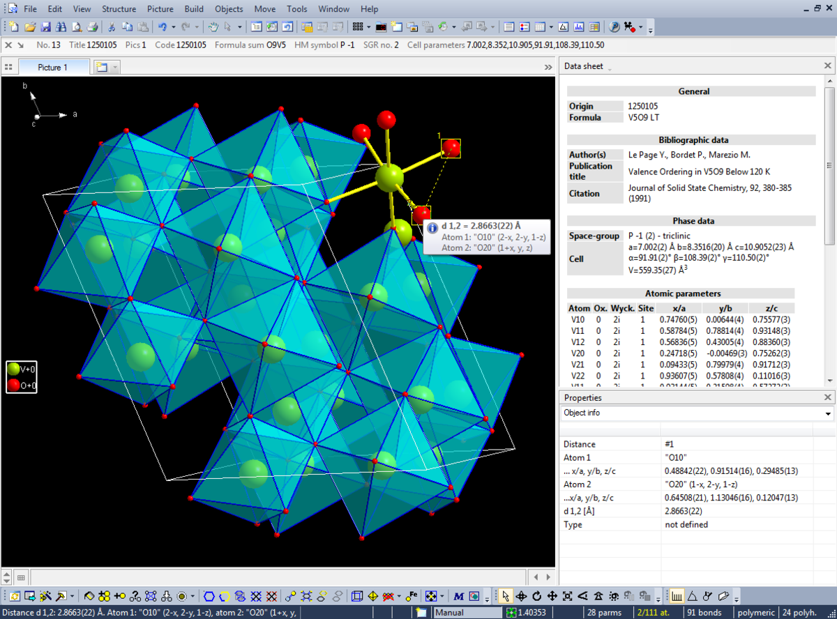 Diamond ist ein Programm zur Visualisierung von Kristallstrukturen und Einzelmolekülen. Es enthält sehr viele Darstellungsoptionen. Man kann auch unterschiedliche Modelle in einem Bild kombinieren. Diamond kann Atome als Kugeln, Kalotten oder Ellipsoide darstellen und Bindungen in Draht- oder Stabform. Es lassen sich auch Polyeder einfügen. Zwischen Atomen, Ausgleichsgeraden und Ausgleichsebenen kann man Abstände, Winkel und Diederwinkel messen.