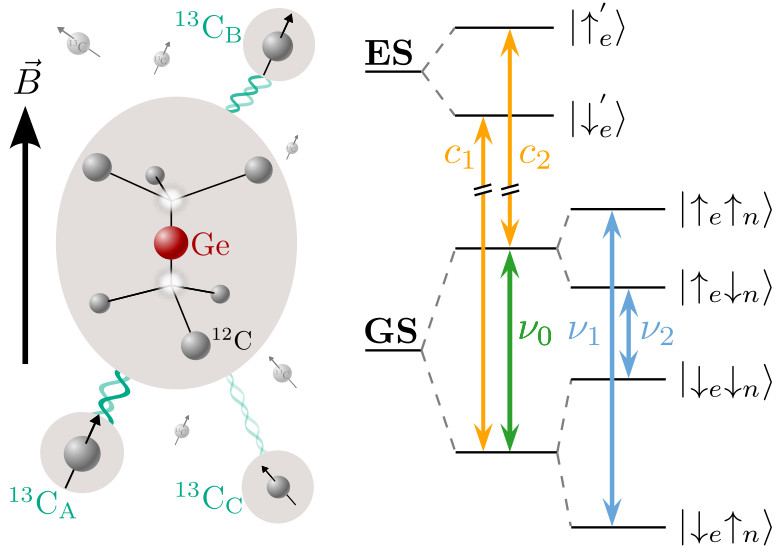 Darin adressieren wir eine der zentralen Herausforderungen von Group-IV-Farbzentren – ihre Spin-½-Natur, die den Zugang und die Kontrolle benachbarter Kernspins bislang stark erschwert hat. Mithilfe von Korrelationsspektroskopie gelingt uns die präzise Identifikation und selektive Kontrolle einzelner Kernspins in der Umgebung eines Germanium-Vakanz-(GeV⁻)-Zentrums. Durch das hochpräzise Single-Shot-Readout sowohl des Elektronenspins (95,8 %) als auch eines gekoppelten ¹³C-Kernspins (93,7 %) ebnen wir den Weg zu Feed-Forward-Protokollen, Quanten-Fehlerkorrektur und robusten Quanten-Netzwerkknoten.