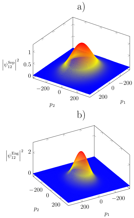 Fig. 2: For the optimized pointer states we obtain in the separable case a) as well as in the entangled case b) a Gaussian. Both states are squeezed and the entangled probability density is more located in the momentum space as in the separable case.