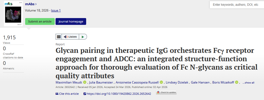 Glycan pairing in therapeutic IgG orchestrates Fcγ receptor engagement and ADCC: an integrated structure-function approach for thorough evaluation of Fc N-glycans as critical quality attributes https://doi.org/10.1080/19420862.2026.2652642
