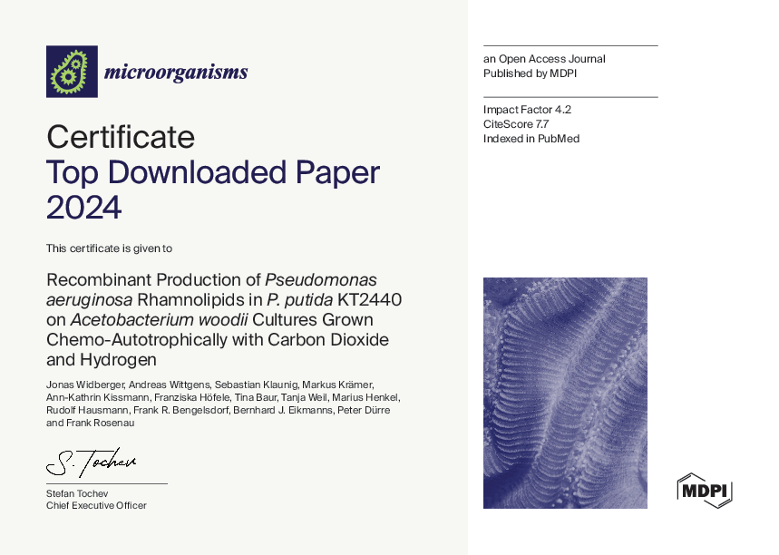 We are pleased to announce that our paper, “Recombinant Production of Pseudomonas aeruginosa Rhamnolipids in P. putida KT2440 on Acetobacterium woodii Cultures Grown Chemo-Autotrophically with Carbon Dioxide and Hydrogen,” has been recognized as a Top Downloaded Paper of 2024 in Microorganisms, published by MDPI. This distinction reflects the high level of visibility and readership the article has achieved within the scientific community.