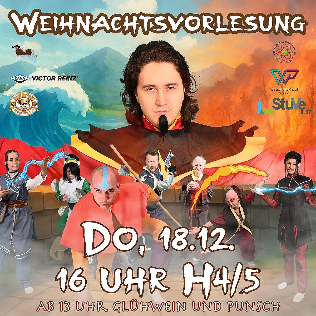 Am Donnerstag, 18. Dezember, 16:00 Uhr entführt euch der Herr der Experimente in den H4/5 zur Weihnachtsvorlesung 2025. Es erwarten euch spannende Experimente passend zu den vier Elementen „Wasser, Erde, Feuer & Luft“. Freut euch auf ein feurig-nasses Theater mit einer geballten Ladung an Action unter Regie von Reiner Keller.