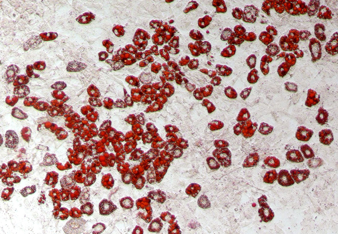 Fettzellen der Maus aus der Zellkultur; rot gefärbt: Lipide in der Zelle
