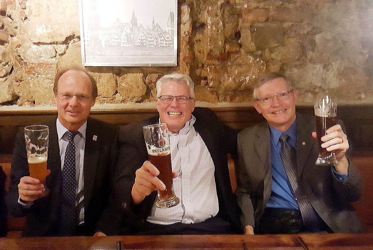 Zum Abschluss dankte Universitätspräsident Professor Michael Weber dem amerikanischen Gast mit einem echten Württemberger Wein für dessen faszinierende Einblicke in die Nanowelt. Beim gemeinsamen Abendessen danach nahm auch der kurz zuvor aus Frankfurt angereiste US-Generalkonsul James W. Herman teil. Dieser demonstrierte sehr eindrucksvoll, wie gut sich die US-amerikanische Politik mit deutschem Bier diskutieren lässt. Kurzerhand bestellte er für seinen Landsmann Moerner, der gerne einen regionalen Wein probiert hätte, ein dunkles Hefeweizen.