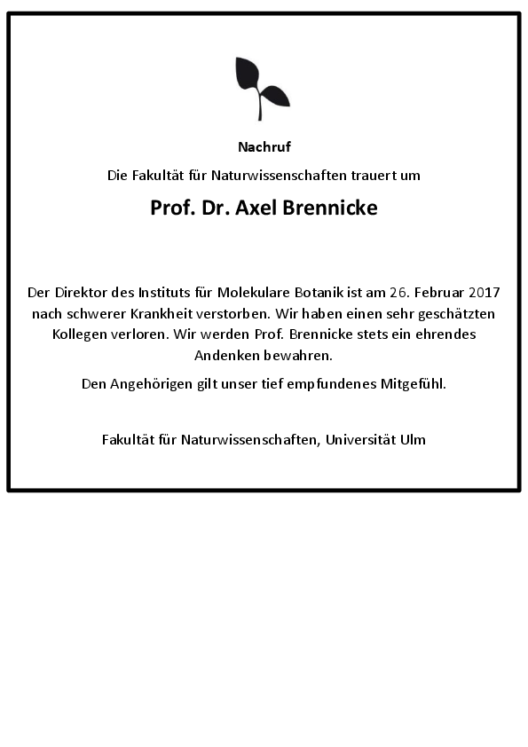 27. Februar 2017 Nachruf Prof. Dr. Axel Brennicke Universität Ulm 28. Februar 2017 Universität UlmDie Fakultät für Naturwissenschaften trauert um Prof. Dr. Axel Brennicke, Direktor des Instituts für Molekulare Botanik. Vorheriger Beitrag Forschungs- und Lehrboni vergeben Psychotrauma-, Quanten- und Stochastik-Forscher sowie innovative Lehrkonzepte ausgezeichnet veröffentlicht am: 25. Januar 2017 Nächster Beitrag Zweite Förderperiode für Forschungsgruppe FOR2333 durch DFG bestätigt! veröffentlicht am: 27. Mai 2019